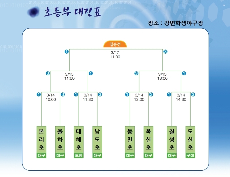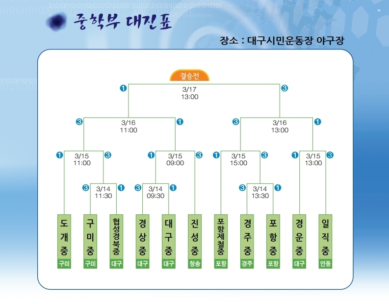 □ 대회개요 1.대회기간 : 2019년 3월 14일(목) ~ 3월 17일(일)〖4일간〗 2.대회장소 : 중학부 – 대구시민운동장야구장 초등부 – 대구강변학생야구장 3.대회운영 : 주최 - 대구광역시야구소프트볼협회 주관 - 경상북도야구소프트볼협회, ㈜놀레벤트 4.공식후원 : 삼성라이온즈 |