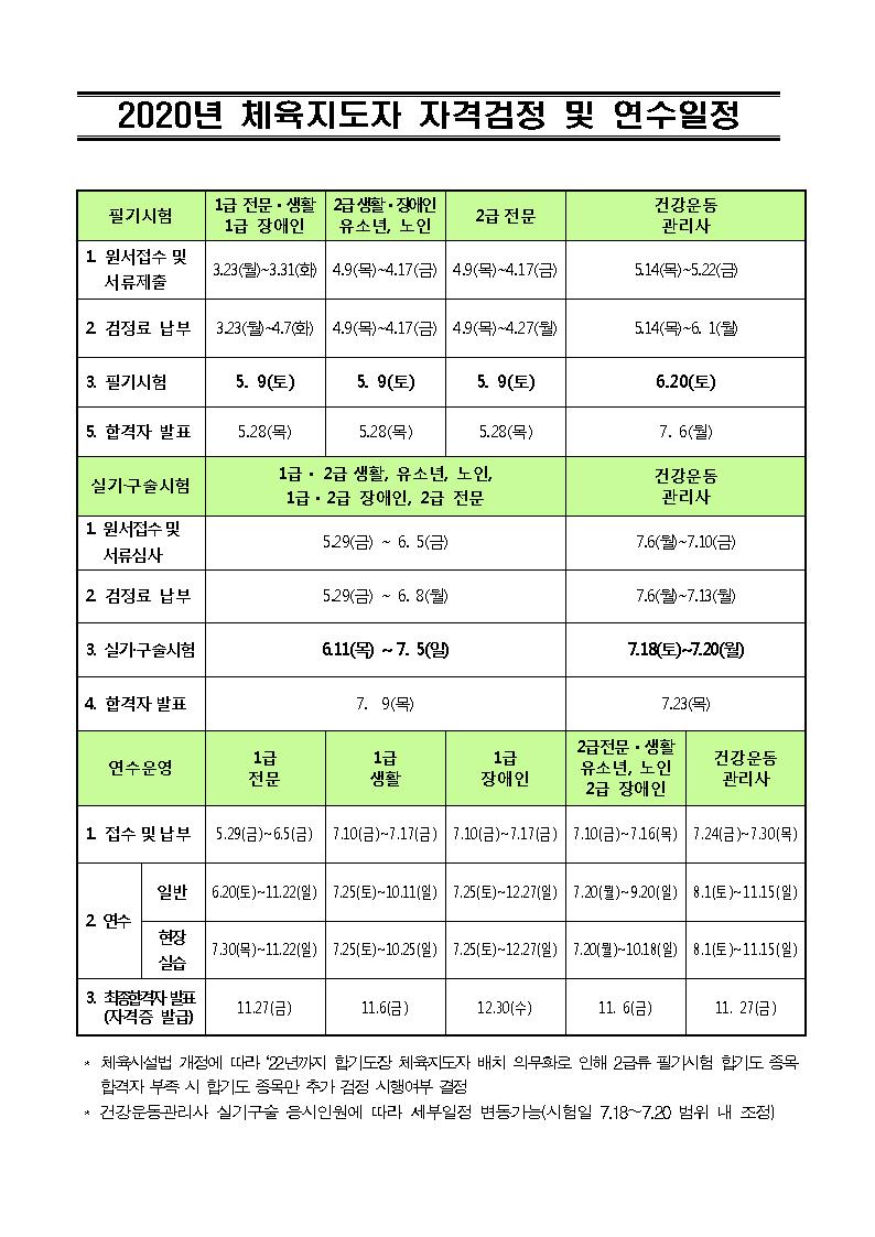 2020년도 체육지도자 자격검정 일정 및 시행계획 공고 안내드립니다.