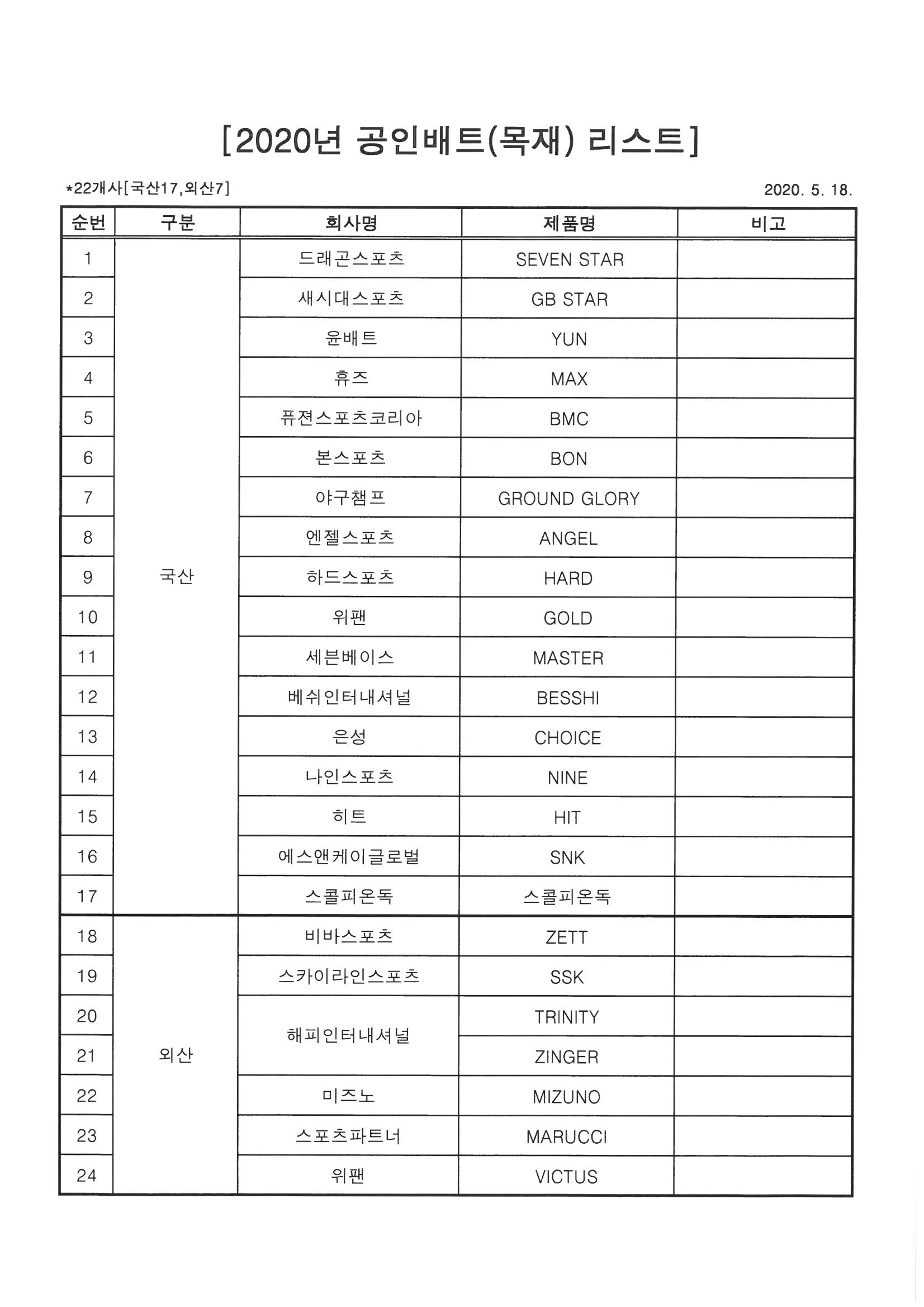 | 2020년 공인 배트(목재) 리스트 (2020.5.18.) |