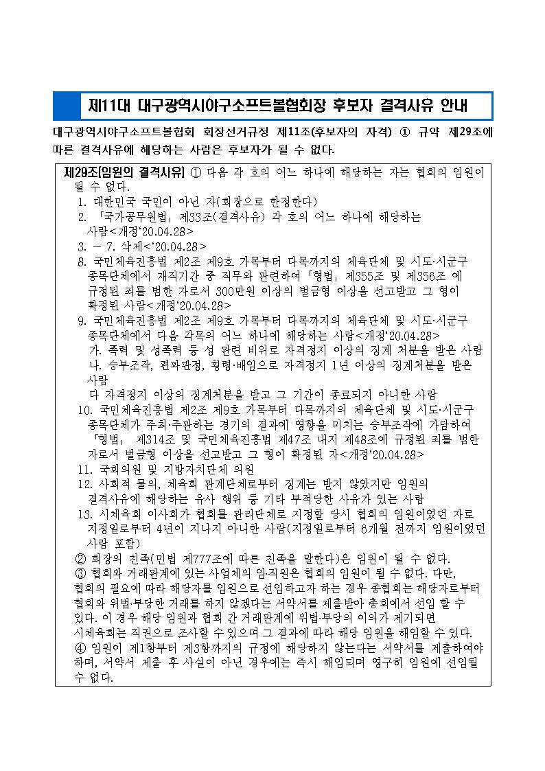제11대 대구광역시야구소프트볼협회장 선거 후보자 결격사유 안내
