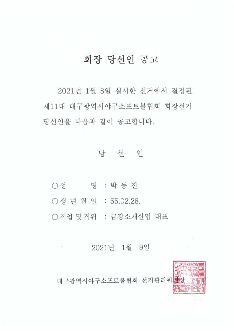 제11대 대구광역시야구소프트볼협회 회장 당선인 공고