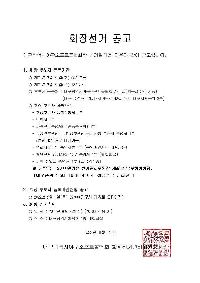 제12대 대구광역시야구소프트볼협회장 선거 공고