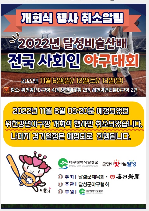 2022년 달성비슬산배 전국 사회인 야구대회 개회식 취소 안내
