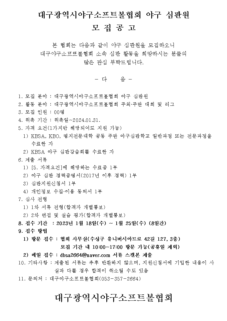 대구야구소프트볼협회 야구 심판원 모집공고