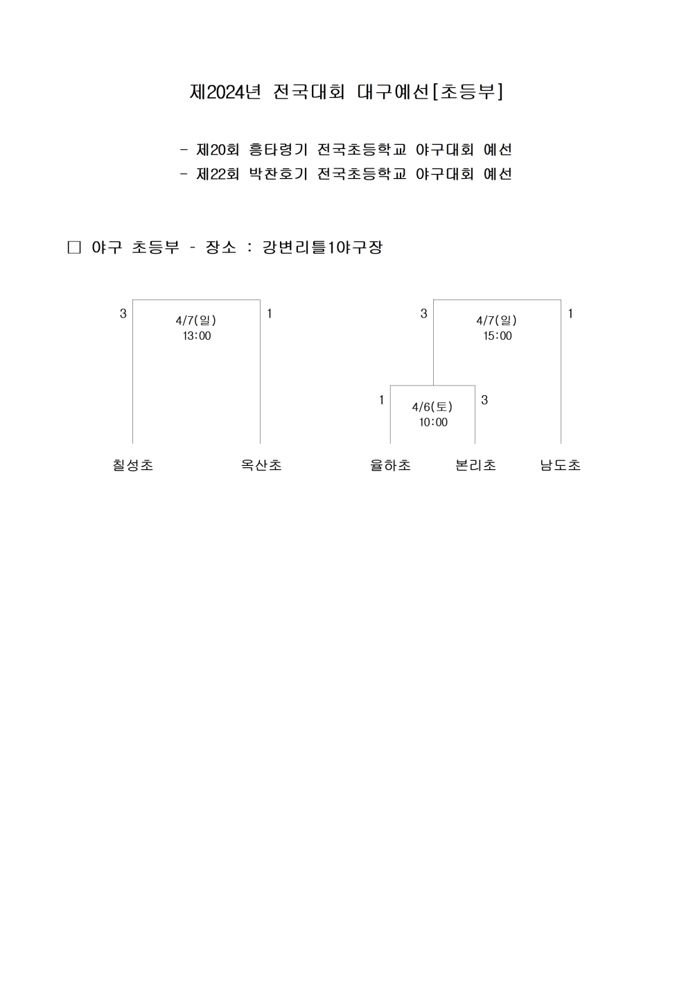 제2024년 전국대회 예선대회 [초등부] * 제22회 박찬호기 전국초등학교야구대회 예선일정(6월 11일~12일)은 전국대회 예선대회[초등부]의 동시개최로 4월 6일 ~7일로 변경 진행됩니다. |
